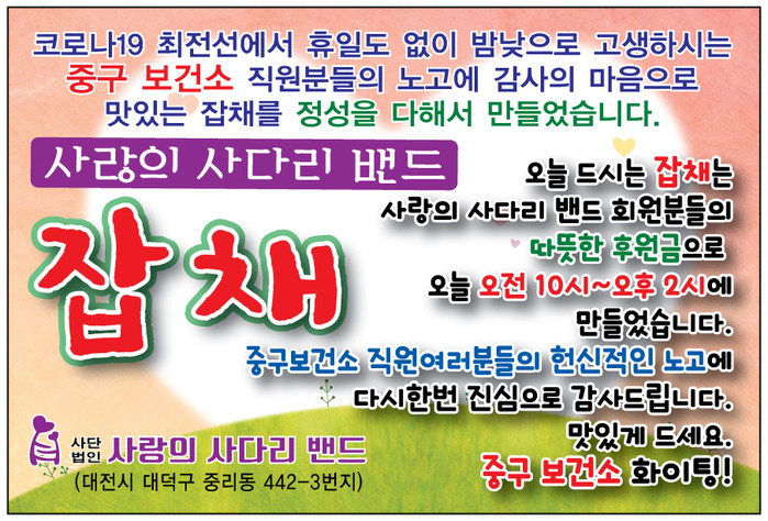 중구보건소 임금식 감염병관리계장은 “오늘 사랑의 사다리 밴드 봉사단체에서 맛있는 잡채를 지원해 주어서 큰 힘과 위안이 된다.”면서 “코로나19의 종식을 위해서 중구보건소는 최선의 노력을 다하겠다.”고 말했다.