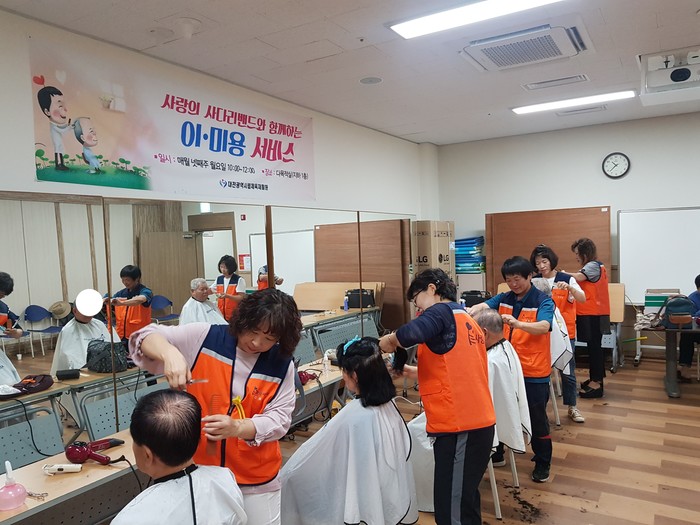 이날 미용봉사에는 김미경, 김현옥, 송남석, 이하영, 조은숙 가위천사들이 대전시체육재활원 30명의 장애인들에게 미용봉사를 하였다.