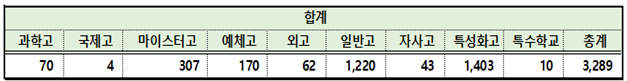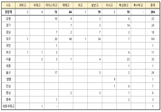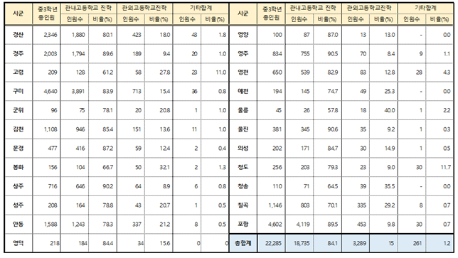 한편, 타 시도로 진학한 학생 294명이 진학한 지역은 대구가 141명으로 가장 많았고, 다음은 서울 33명, 인천ㆍ경기 각 24명, 강원 23명 등으로 나타났다. 학교 유형별로는 일반고 79명, 마이스터고 72명, 특성화고 70명, 예체고 64명 순으로 나타났다.