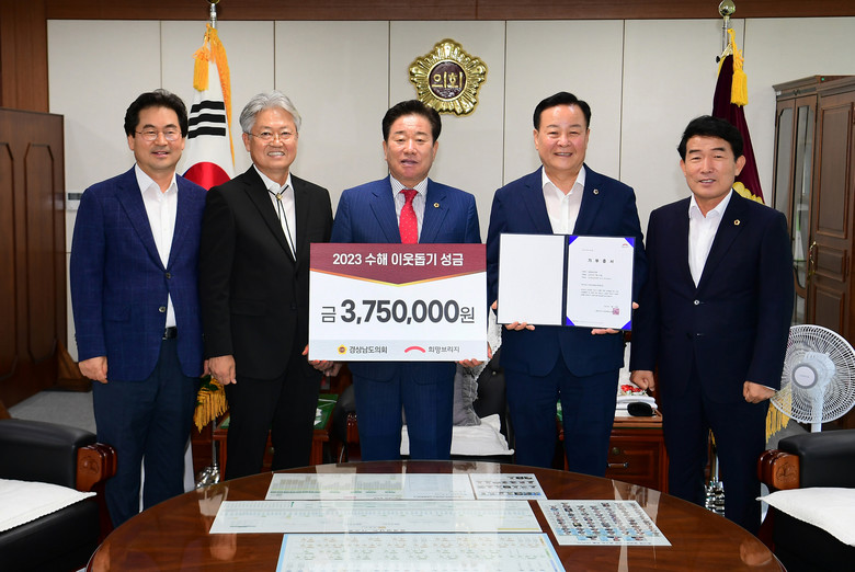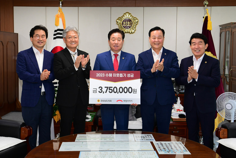 [경남 세계타임즈=최성룡 기자] 경상남도의회(의장 김진부) 64명 전의원들은 기록적인 집중호우로 피해를 입은 지역의 이재민 지원과 수해지역 복구를 위해 성금 375만원을 희망브리지 전국재해구호협회에 기탁했다.