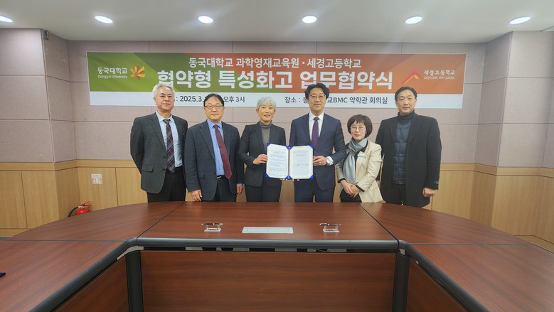 [파주시 세계타임즈=송민수 기자] 파주 세경고등학교(교장 장계홍)는 동국대학교 과학영재교육원(원장 권영은, 행정팀장 주현석), BMC 지역산업 R&D 지원센터(행정처장 유한림, 지역협력팀장 변재덕, 지역협력팀 과장 김학원), 파주시청 평생교육과장(최희진)이 참석한 가운데 협약식을 개최했다.