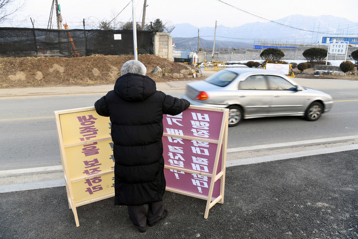 [양구군=세계타임즈 김민석 기자] 양구읍 안대리 헬기부대 확대반대투쟁위원회 사무국장인 김철 군의원이 25일 항공대대 앞에서 1인 시위를 벌였다. 확대반대투쟁위원회는 26일부터 안대리 학조리 주민, 양구지역 사회단체장들의 1인 시위가 렐레이로 이어진다.