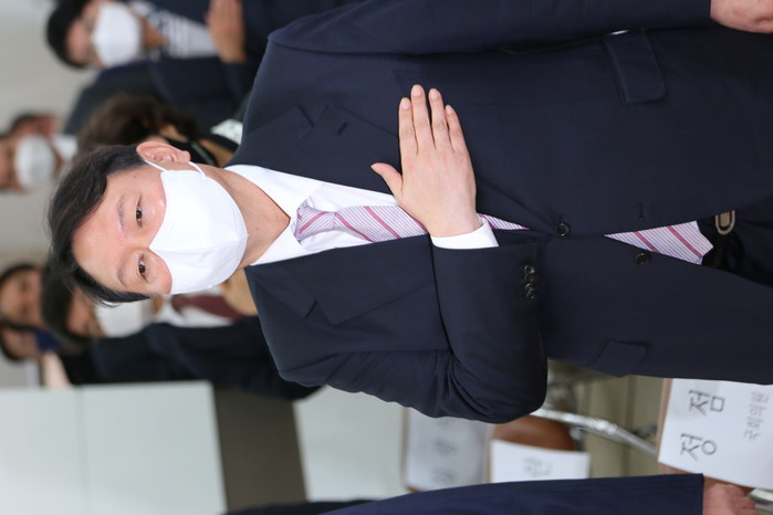 윤석열 '경남선대위 임명장 수여식'에 참석해 국기에 대한 경례