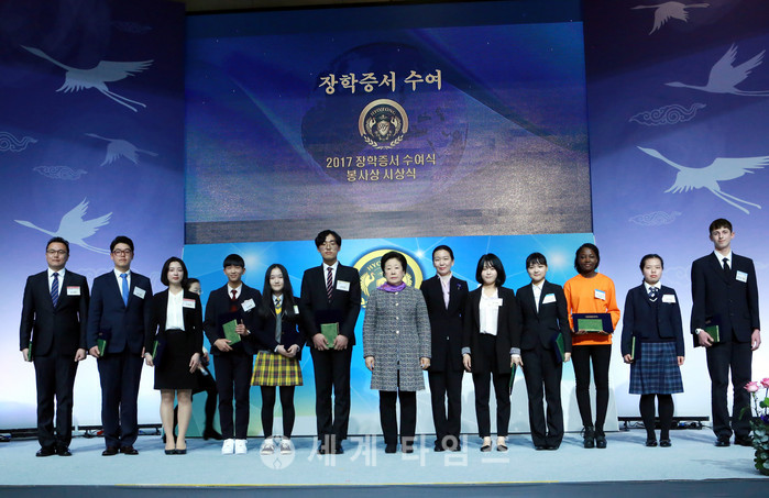 5일 오후 경기도 가평 청심국제청소련수련원 대강당에서 열린 ‘재단법인 효정세계평화재단 2017 장학증서 수여식 및 봉사상 시상식’에서 한학자(가운데) 총재와 장학생들이 기념촬영을 하고 있다. 이날 행사에는 전체 장학생을 대표하여 한국, 미국, 영국, 독일, 프랑스, 오스트리아, 브라질, 멕시코, 니카라과, 일본, 대만, 네팔, 말레이시아, 호주, 뉴질랜드, 솔로몬 제도, 러시아, 루마니아, 시리아, 이스라엘, 가나, 르완다, 우간다, 잠비아, 카메룬 등 전 세계에서 88개국 800여명의 학생수여자들이 참석했다. 2017.02.05.(사진=재단법인 효정세계평화재단 제공)