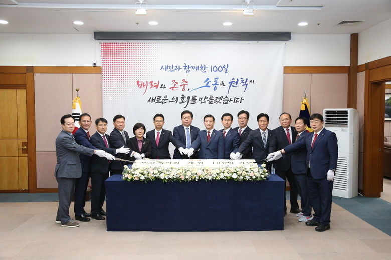 이어서, 출범 이후 100일 성과에 대해 역대 가장 화합적인 의장단 선출과 원 구성을 시작으로 2개 특별위원회를 역대 최단기간 발족하고, 역대 최대 규모의 추경예산안을 민생회생의 관점에서 엄중하게 심의하는 등 흔들렸던 의회의 위상을 제자리에 돌려놓고 ‘일하는 의회’ 시스템 강화에 집중했다고 자평했다.
