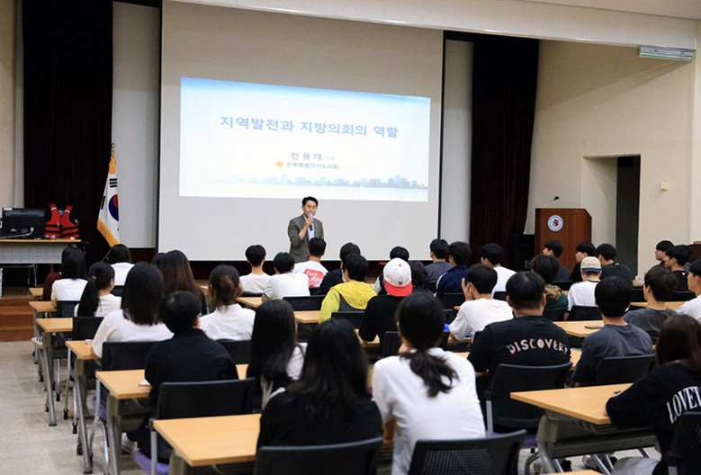 전용태 의원은 해양ㆍ안전체험 교육을 위해 입교한 무주고등학교 1학년 80여 명을 대상으로 “지방의회와 지역발전”이라는 주제로 특강을 진행했다. 전 의원은 지방의회의 역사와 역할 등을 학생 눈높이에 맞게 설명하고, 본인이 정치에 입문한 계기와 과정 등에 대해서도 친근감이 있게 이야기하며 강의를 이어갔다.