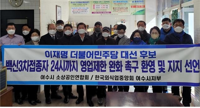 [세계타임즈 이채봉 기자]전남 여수지역 골목상권 사장님들이 더불어민주당 이재명 후보의 ‘3차 접종자, 24시까지 영업제한 완화 촉구’에 대해 환영 성명을 발표하고 적극 지지를 선언했다.