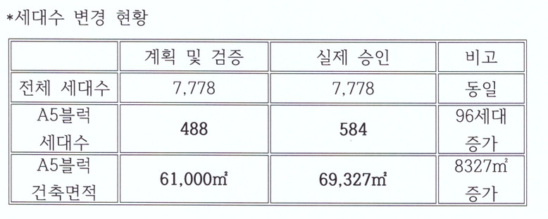 또, “도시공사는 96세대 증가에 따른 용적율과 분양가능 면적 변경이 없다고 하지만 용적율은 177%에서 199%로 올랐고, 건축면적 또한 61000㎡에서 69327㎡로 증가했다”고 덧붙였다.