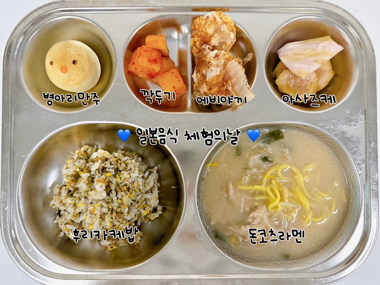은계유치원 식생활교육관에서는 일본의 대표적인 후리가케밥, 돈코츠라멘, 에비야끼, 아사즈케, 만주를 식단으로 제공하여 유아들에게 일본의 다양한 음식을 경험해볼 수 있도록 하였다.