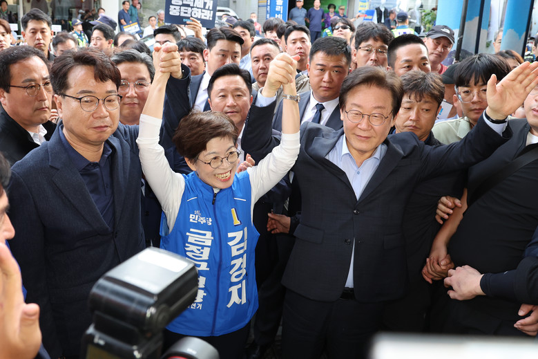 [세계타임즈 = 신상철 기자] 10·16 금정구청장 보궐 선거를 앞두고 24일 오후 부산 금정구 서동미로시장에서 이재명 더불어민주당 대표와 김경지 금정구청장 후보자·지도부가 상인 및 시민 등과 인사하며 지지를 호소하고 있다. 2024.9.24