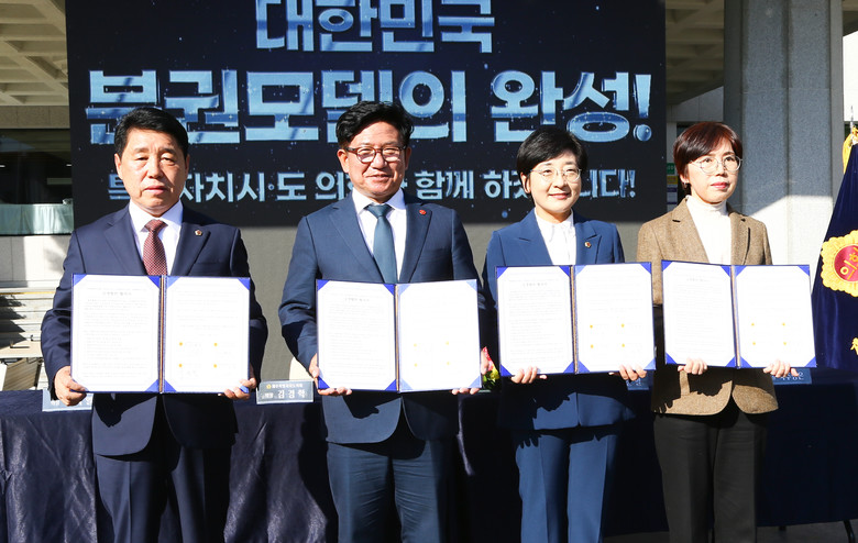 [강원도 세계타임즈=김민석 기자] 강원특별자치도의회(의장 권혁열)는 11월 1일 개최된 제주특별자치도의회 주관「지방분권 의정박람회」에서 제주특별자치도의회, 세종특별자치시의회, 전라북도의회와 상생협력 협약을 체결하였다.