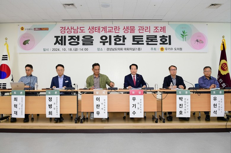 우기수 의원이 좌장을 맡아 진행하였고, 이찬우 이사(한국습지학회), 정병희 과장(경상남도 환경정책과), 최혁재 교수(창원대학교 생물학화학융합학부), 박진호 선임연구위원(경남연구원), 유현석 사무총장(창원 YMCA)이 참여하여, ‘경상남도 생태계교란 생물 관리를 위한 조례 제정 방향’에 대해 다양한 의견을 제시했다.