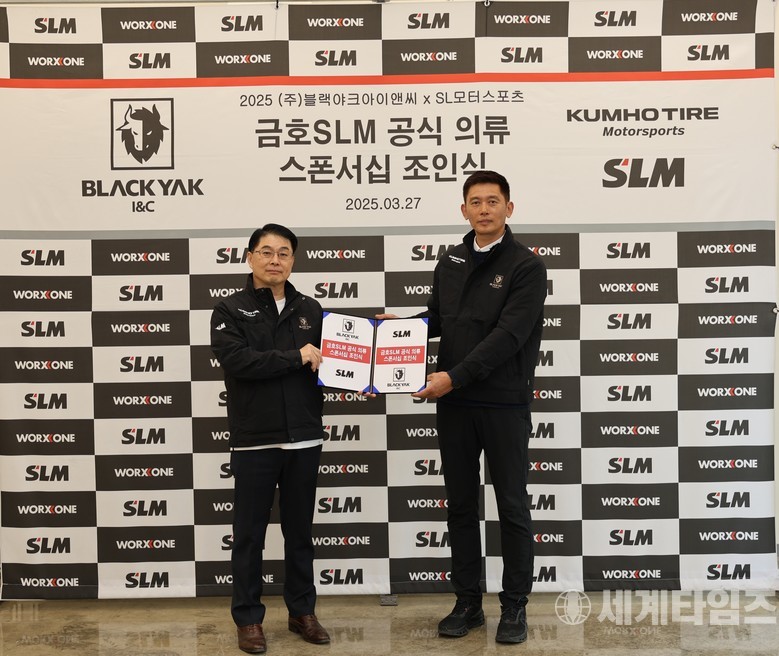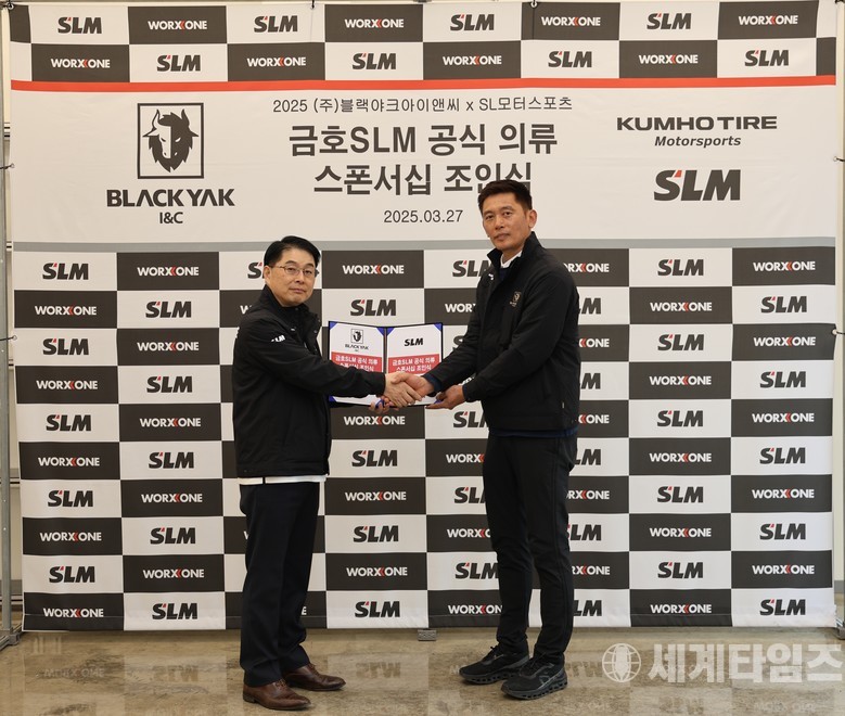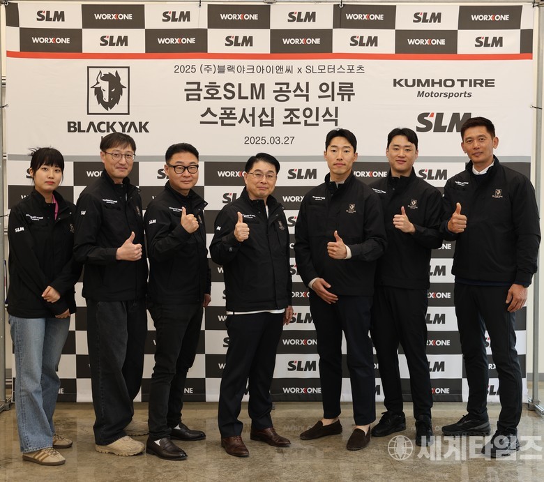 [세계타임즈=방춘재 기자] 금호타이어가 후원하는 국내 대표 모터스포츠 팀 ‘금호 SLM’이 3월 27일(수) 경기도 용인시에 위치한 팀 본사에서 글로벌 아웃도어 브랜드 ‘블랙야크 아이엔씨’와 공식 의류 스폰서십을 체결했다.