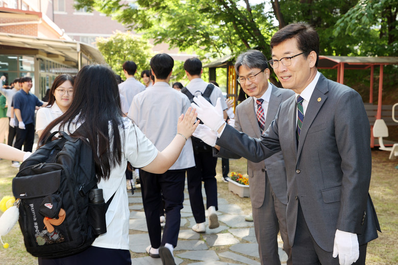친구사랑 ‘하이파이브데이’ 및 ‘스승, 존경의 대상’을 주제로 하는 이번 아침맞이 캠페인에는 윤건영 충청북도교육감도 함께 참여하여 자리를 빛냈다.