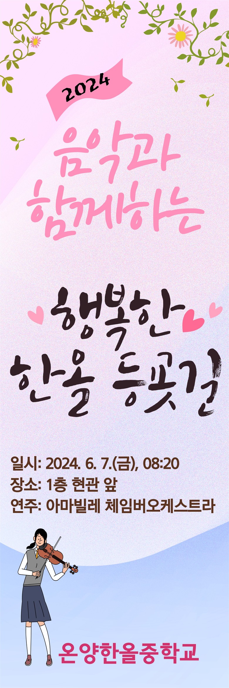 중학교 1층 현관 앞에서 연주하는 20분 동안 등교하는 학생과 출근하는 선생님들의 발길을 잠시 멈추게 한 이번 공연은 모두에게 좋은 추억이 되었을 것으로 생각하며,