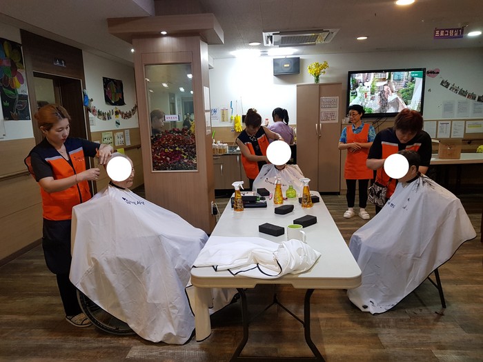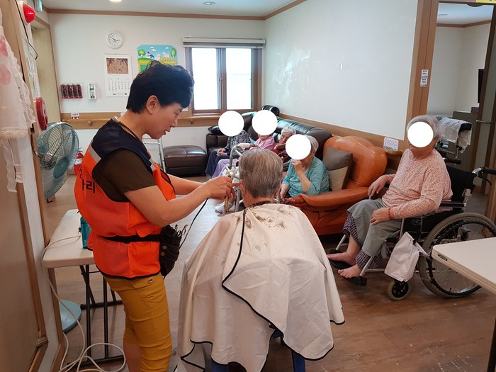 이날 미용봉사는 박유신(머리만들기, 와동), 윤성애(가위소리, 덕암동), 이미향(투투미용실, 가양동), 채경숙(채련화미용실, 중리동)등 미용실을 운영하는 회원들이 생업을 잠시 미루고 요양원1,2층과 별관에서 미용봉사를 하였다,