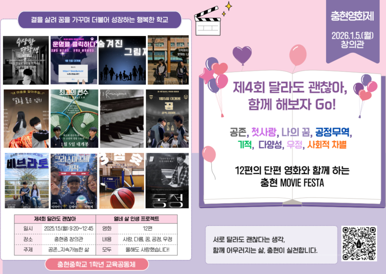 이번 영화제는 충현중학교 교육과정과 연계한 학생 참여형 프로젝트 활동으로 운영됐으며, 학생들은 기획부터 시나리오 작성, 촬영, 편집, 상영에 이르기까지 전 과정을 주도적으로 수행했다.