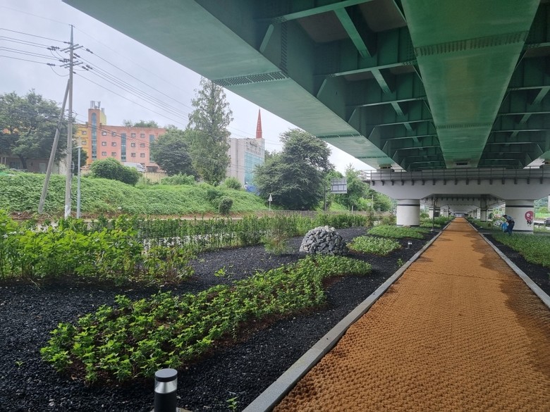 이에 안성시는 고가 하부 공간 특성을 고려해 남측과 북측으로 구분해 조성했다. 일조량이 풍부한 남측(중앙대학교 방향)에는 다양한 식생을 식재하고 북측(롯데캐슬 아파트 방향)에는 음지 식물과 함께 게비온 옹벽, 열주 등 생태시설물을 설치했다.