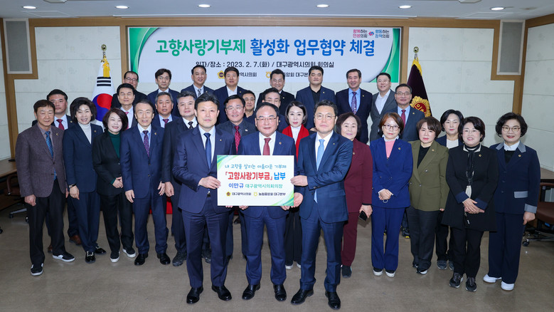 이날 협약식에는 대구시의회 전체 의원이 참석해 고향사랑기부제의 성공적 정착을 도모했다. 고향사랑기부제의 활성화를 통해 지역 경제에 활력을 불어넣고, 열악한 지방재정을 보완할 수 있는 제도로 자리매김할 수 있도록 한마음으로 뜻을 모았다.