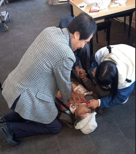 건설소방위원회 소속 이우청 도의원(김천2)이 25일(수) 김천시 신음동 조각공원 인근 식당에서 지인들과 점심식사를 하던 중 옆 테이블에서 식사를 하던 70대 여성이 화장실로 향하다가 갑자기 쓰러지자 이를 발견하고 즉시 달려가 심폐소생술을 실시했다.