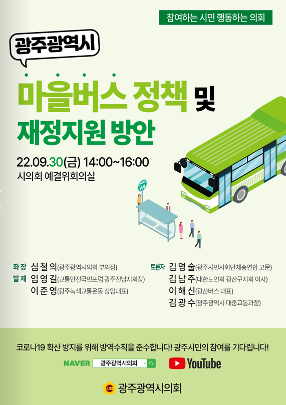 발제자인 임영길 교통안전국민포럼 광주전남지회장은 광주시 마을버스 지속가능성 방안, 이준영 광주녹색교통운동 상임대표는 전국 마을버스 공공성 강화 정책 및 광주시 마을버스 현실을 주제로 각각 발제한다.
