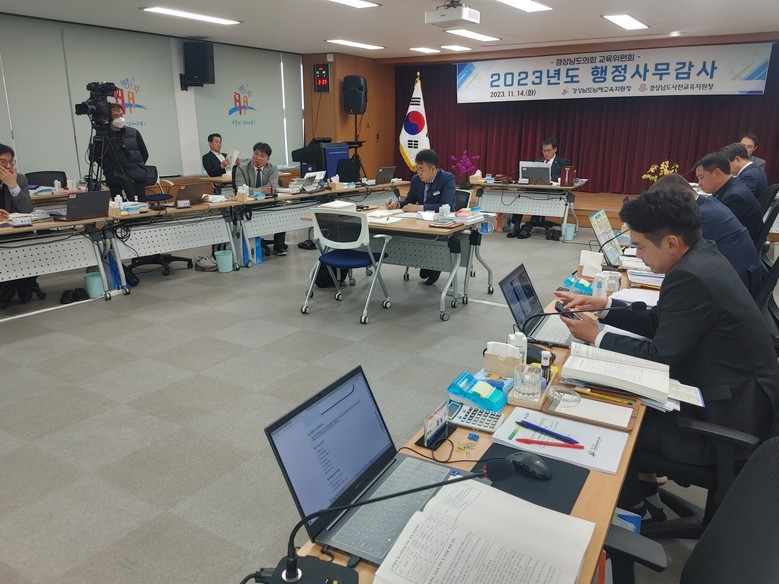 [경남 세계타임즈=최성룡 기자] 경상남도의회 교육위원회가 제409회 정례회 기간인 14일 남해교육지원청에서 남해·사천 2개 교육지원청을 대상으로 행정사무감사를 벌였다. 이날 감사에서는 산업수요맞춤형 및 특성화고등학교 운영, 선제적 학교 통폐합의 필요성, 지원청의 사업별 집행률 등과 관련된 질의와 점검이 이뤄졌다.