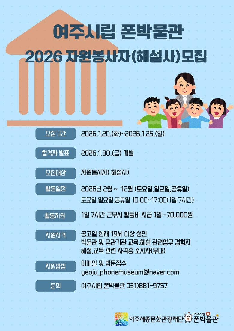 이번 모집은 박물관 전시 해설에 관심이 있고, 관람객과의 소통을 통해 전화기와 통신의 역사적 가치를 전달할 수 있는 인력을 대상으로 진행된다. 선발된 자원봉사자는 여주시립 폰박물관 상설 및 기획전시 해설을 맡아 관람객 응대와 전시 이해를 돕는 역할을 수행하게 된다.