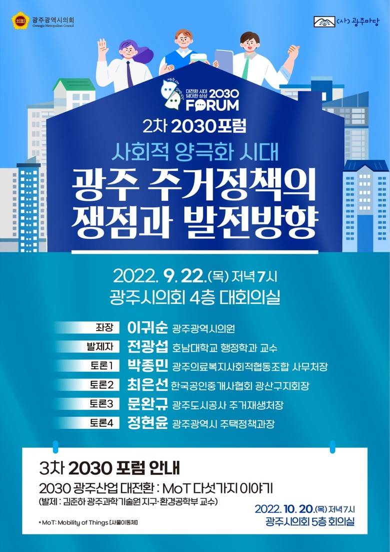 [광주 세계타임즈=손권일 기자] 광주시의회는 (사)광주마당 2030포럼과 공동으로 ‘사회적 양극화 시대 광주 주거정책의 쟁점과 발전방향’을 주제로 오는 22일(목) 광주시의회 4층 대회의실에서 토론회를 개최한다.