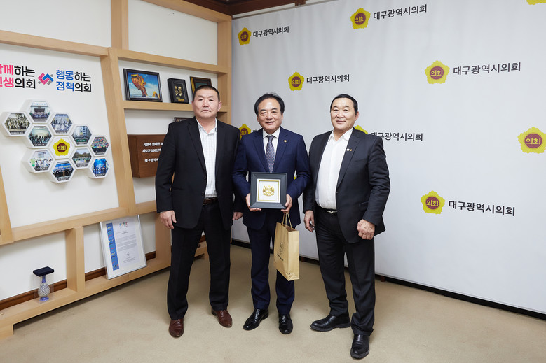 [대구 세계타임즈=한윤석 기자] 대구시의회 이만규 의장과 이재화 국민의힘 원내대표, 손한국 의원은 11월 28일(화) 오전 11시 30분 시의회 접견실에서 대구시 관광·체육분야 시찰 및 국제교류 협의를 위해 내방한 몽골 울란바토르시 체육회장 간볼드 잠발(Ganbold Jambal) 일행과 면담했다.