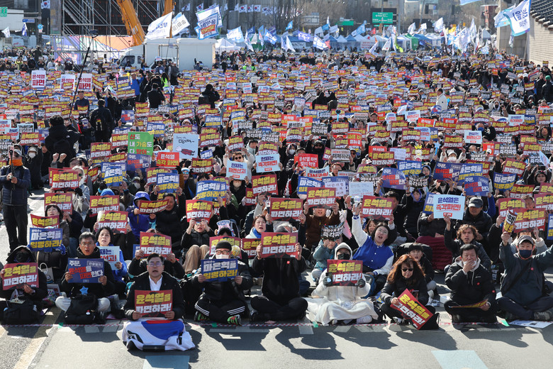 [세계타임즈 = 심귀영 기자] 29일 서울 종로구 동십자각 인근에서 더불어민주당 박찬대 원내대표, 조국혁신당 김선민 대표 권한대행 참석하에 열린 야5당 대통령 탄핵 촉구 사전집회에서 참가자들이 구호를 외치고 있다. 2025.3.29