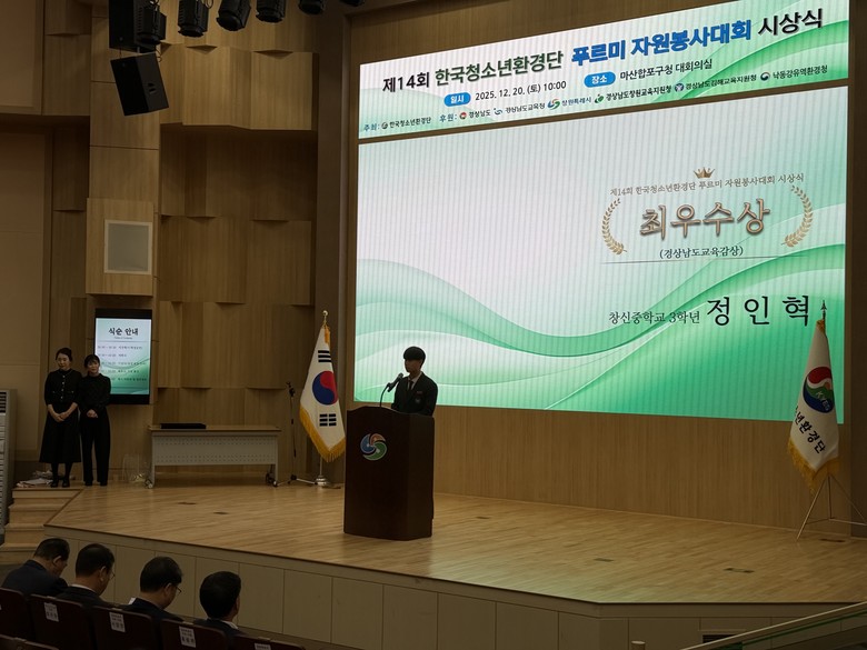 [세계타임즈]최성룡기자 = 한국청소년환경단(총재 남성용)은 12월 20일(토) 마산합포구청 대회의실에서 ‘제14회 한국청소년환경단 푸르미 자원봉사대회 시상식’을 개최했다.