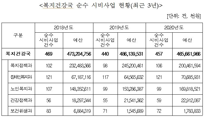 특히 2020년도의 경우 부산시 복지건강국의 순수 시비사업예산은 오히려 감소하였다. 국비로 지원하는 복지사업의 예산 증가로 부산시가 부담해야 할 국비 매칭 지방비의 증가로 발생한 현상이다.