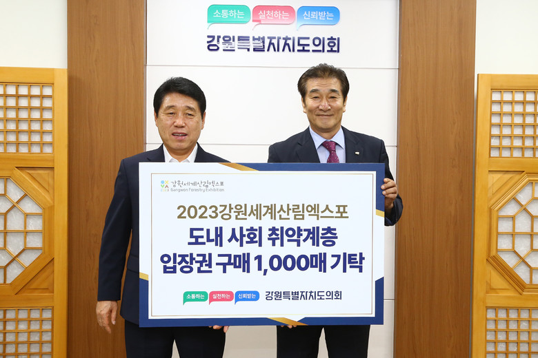 9월 15일 도의회 의장실에서 강원특별자치도사회복지협의회(회장 홍기종)와 산림엑스포 입장권 기탁식을 가지고, 도내 취약계층에게 지원할 2023 강원세계산림엑스포 입장권 1,000매를 전달했다고 밝혔다.