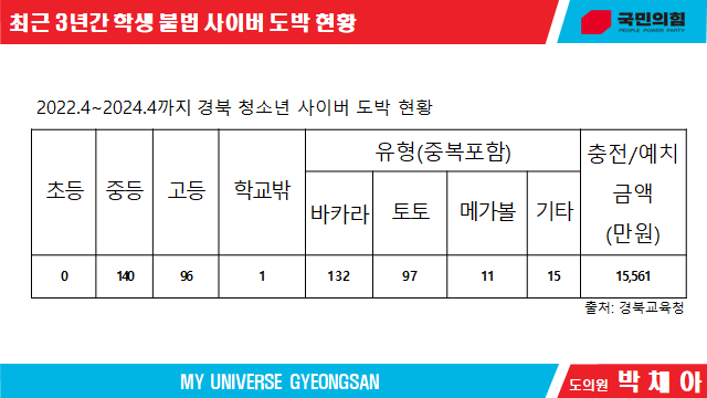 박채아 의원이 분석한 자료에 따르면(경북교육청 제공) 2022.04월부터 2024.04월까지 도내 12개 시군에서 236명의 중·고등학생이 사이버 도박에 가담한 것으로 나타났고, 이들의 도박자금 총액은 15561만원,이며 바카라 132명, 스포츠 토토 97명, 메가볼 11명, 기타 15명 순으로 집계되었다.