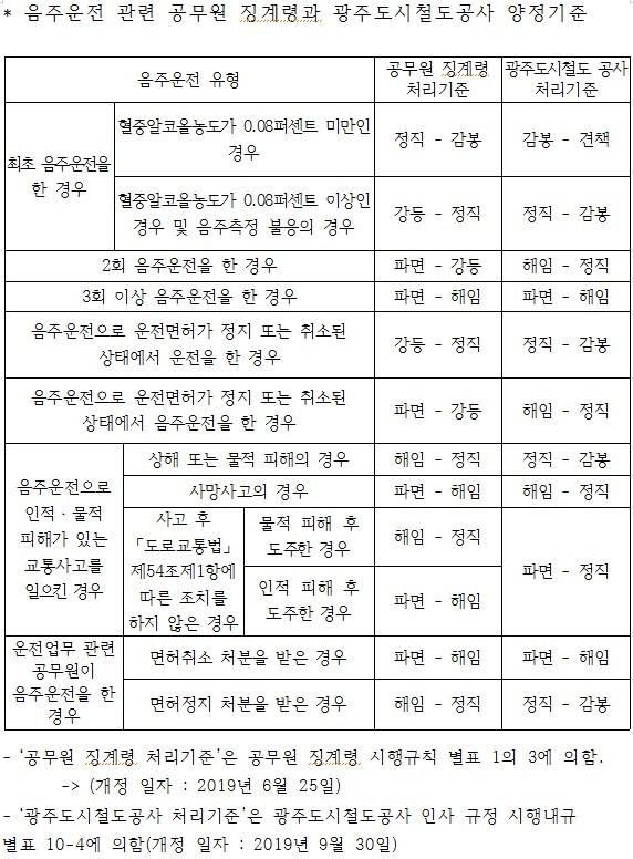 또한 공무원 징계령 시행규칙 별표 1의3에 의해 음주운전 양정기준을 마련하고 있고 광주도시철도공사 역시 광주도시철도공사 인사 규정 시행 내규를 통해 음주운전 징계기준을 정하고 있다.