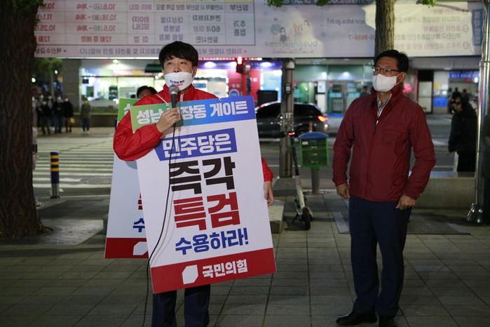 국민의힘 이준석 대표가 18일 오후 부산 부산진구 NC백화점 서면점 앞에서 '대장동 게이트 특검'을 촉구하는 도보 1인 시위를 벌이며 인사말을 하고 있다.