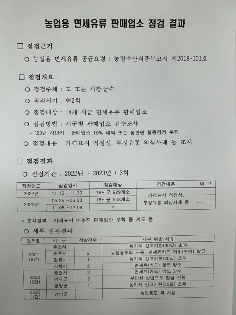 이에, 행정사무감사 시 강원특별자치도가 강정호 의원에게 제출한 농업용 면세유류 판매업소 점검 결과 자료에 따르면, 22년 1회 23년 상반기 1회 점검 후, 현재 하반기 점검이 진행중인 것으로 나타났다.