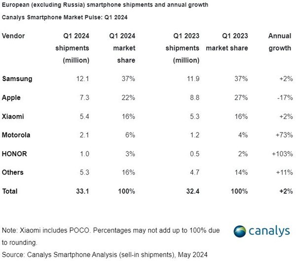 | ▲8일(현지시각) 글로벌 시장조사기관 카날리스에 따르면 삼성전자는 지난 1분기 유럽 스마트폰 시장에서 출하량 1210만대를 기록하며 37% 점유율로 1위에 올랐다. 출하량은 전년 동기 대비 2% 늘었다. (사진=카날리스) |
