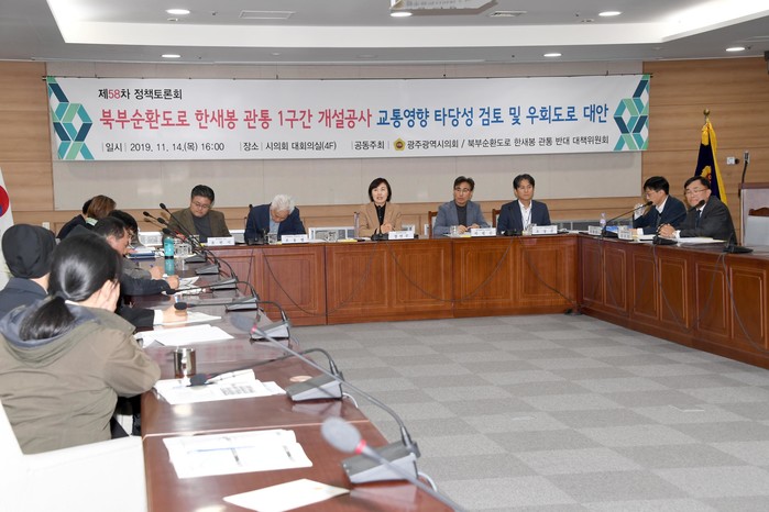 [광주=세계타임즈 손권일 기자] 광주광역시의회는 11월14일 오후4시 시의회 4층 대회의실에서 장연주 의원을 좌장으로 북부순환도로 한새봉 관통 1구간 개설공사 교통영향 타당성 검토 및 우회도로에 대한 토론회를 가졌다.