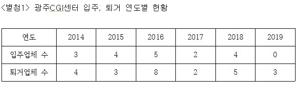 현재 CGI센터에 입주해 있는 업체는 총 22개 업체이다. 지난 2014년부터 2019년까지 퇴거한 업체는 25개 업체이며, 2018년 5개, 2019년 3개 업체가 퇴거했다. 하지만 2018년부터 입주한 업체는 3개 업체에 불과하고 가장 최근 입주한 업체는 2018년 9월 입주했다.