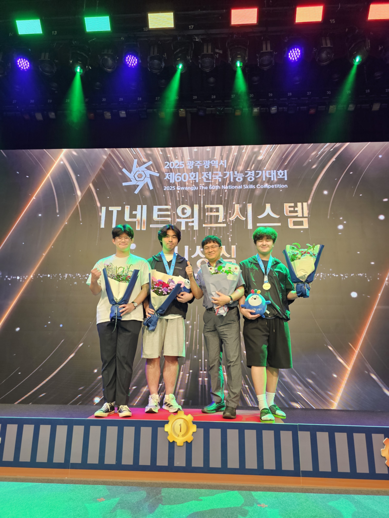 | ▲ IT네트워크시스템 시상식(왼쪽부터 이영서(2학년 우수), 신승호(3학년 금), 지도교사 이래현, 백송주(3학년 금) |