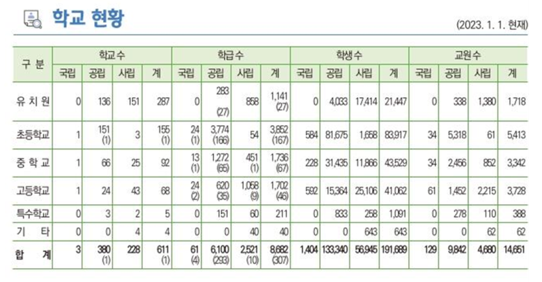 2023년 기준 광주지역 초등학생 수는 83,917명, 학교 수는 155개, 학급수는 3,852개로 지금의 저출생 추이가 지속된다면 6년 뒤부터는 산술적으로 초등학교 절반 이상이 사라지는 셈이다.