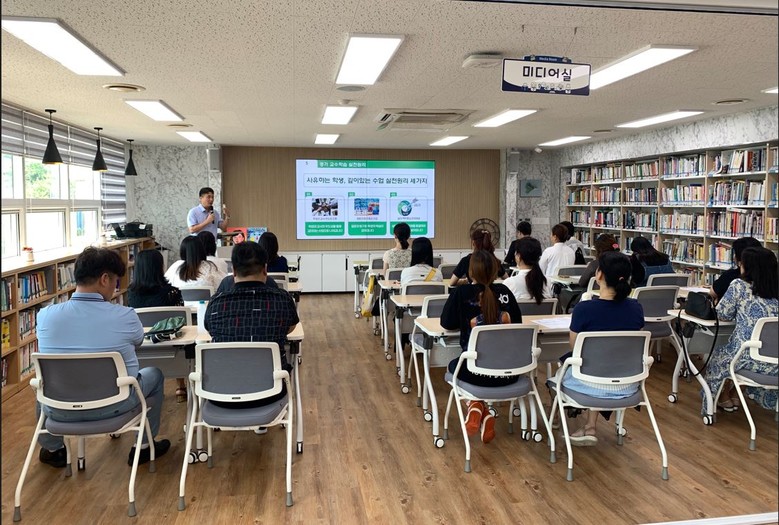 연수를 진행한 교장(김상도)은 미래 변화에 대응할 수 있는 학생들의 역량강화를 위해 ▶학생과 교사의 주도성 강화 ▶질문과 탐구중심 수업 ▶삶의 맥락중심 문제해결 등 수업실천원리에 대해 설명하고 다양한 학생 참여형 수업과 연계하여 사고의 힘을 키우는 평가를 강조했다.