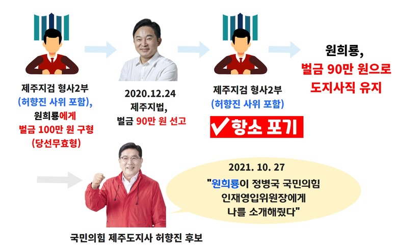 하지만, 당시 제주지검 형사 2부는 “원희룡의 행위가 선거에 영향을 미칠 목적의 기부행위에 해당한다”고 밝히고 당선 무효형인 벌금 100만 원을 구형했음에도 항소를 포기했다. 당시 담당 검사 중 한 명인 A씨는 허향진 국민의힘 제주도지사 후보의 사위로 해당 사건의 공판검사를 맡았는데, 공판검사는 항소 여부를 결정하는 역할을 맡고 있어 원 후보자와 검찰 간의 유착 의혹이 제기되고 있다.