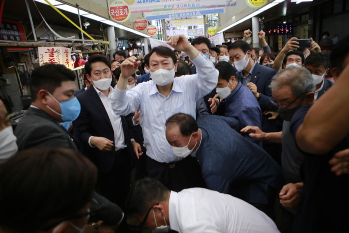 [세계타임즈 이진화 기자]야권 유력대선 후보 국민의힘 윤석열 후보가 추석을 앞두고 경남지역 민심 끌어안기에 방문한 18일 오후 창원시 마산합포구 소재 마산어시장 돼지족발골목에서 지지자들과 상인들의 환호를 하고 있다.