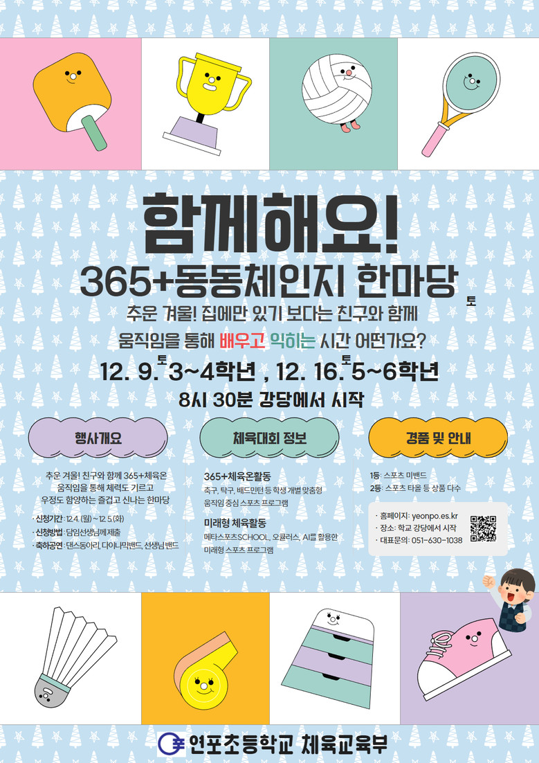 송영철 연포초등학교장은 “추운 겨울이지만 학생들이 다양한 체육 활동으로 긍정적 교우관계 형성과 건강한 도전의식을 고취하길 바란다”며 “학생을 오롯이 성장시키는 교육을 지속적으로 실천해가겠다”고 말했다.