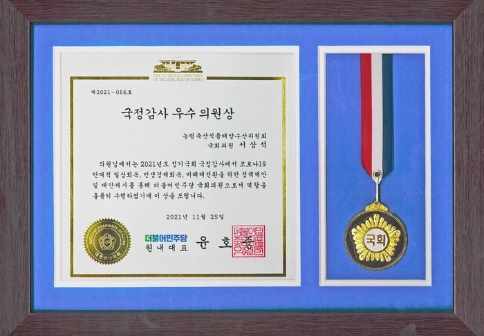 서삼석 의원은 “4년 연속 더불어민주당 국정감사 우수의원상을 받게 돼 매우 영광스럽다”며, “앞으로도 농수축산림인을 대변하고 지속가능한 농어업 환경을 조성하기 위해 최선을 다하겠다”고 수상소감을 말했다.