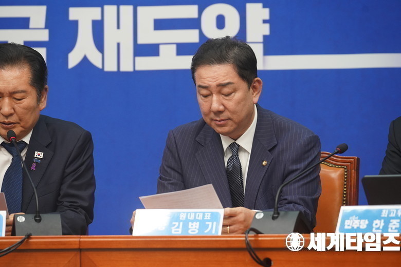 '김병기' 더불어민주당 원내대표가 24일 서울 여의도 국회에서 열린 최고위원회의에서 모두 발언을 하고 있다.