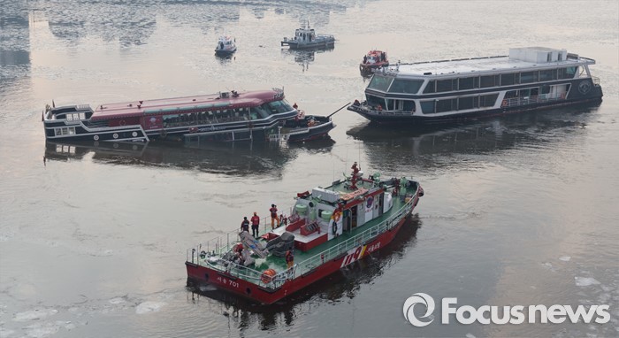 (서울=포커스뉴스) 26일 오후 서울 한강 영동대교 아래에서 한강유람선이 침수돼 구조대원들이 구조활동과 견인 작업을 하고 있다.