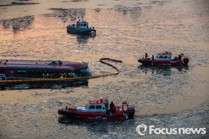 (서울=포커스뉴스) 26일 오후 서울 한강 영동대교 아래에서 한강유람선이 침수되어 관계 당국이 기름 유출을 막기 위해 방재작업을 하고 있다.